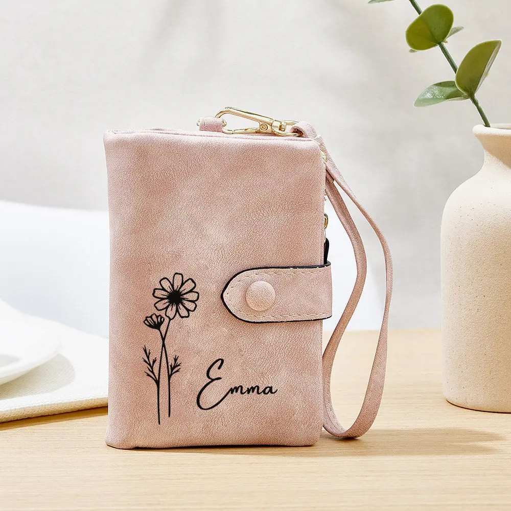 Customized with name and birthday flowers can make your wallet more special. Leather material makes the wallet more comfortable to carry. This wallet with birth flowers can also be a personalized birthday gift, thank you gift, or Mother's Day gift for your loved one.